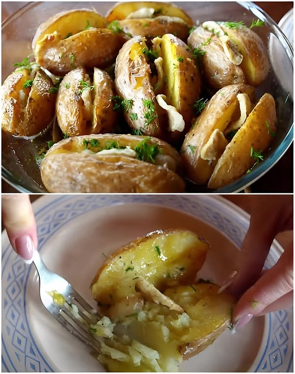 В готовом картофеле сделать надрез вдоль. Выложить в форму, полить растопленным жиром. В разрезы выложить сало и чеснок. Снова полить жиром и поставить в духовку на 10-15 минут при 180 градусах. Перед подачей украсьте зеленью.