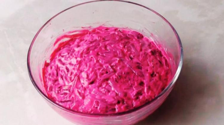 Викладаємо салат у тарілку, зверху посипаємо його буряком, який ми залишили раніше. Смачного!