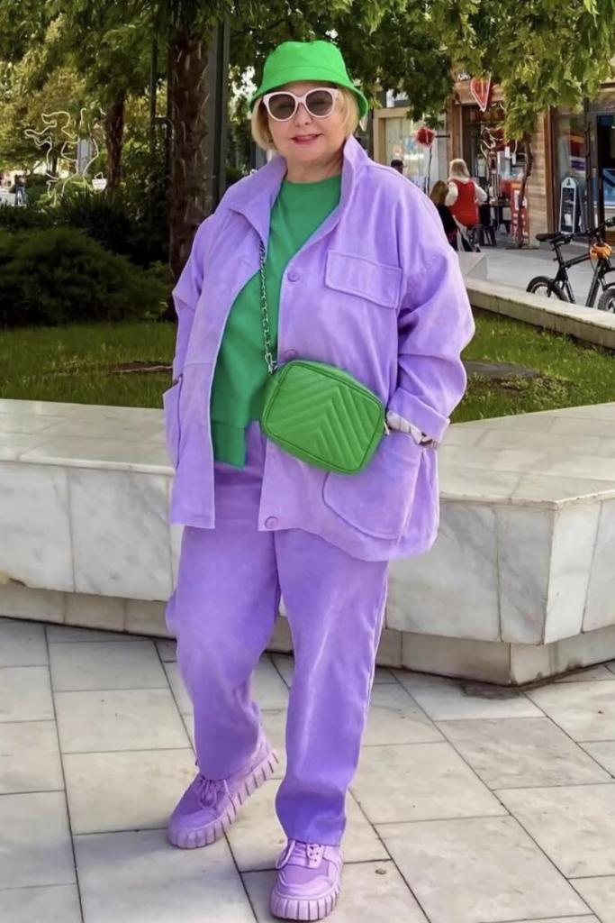 3. Блідо-сиренева сукня з прямими брюками і курткою стане чудовим варіантом для повсякденного прогулянкового образу або зустрічі з друзями. Оригінальне поєднання зеленого кольору футболки, панами і сумки додає образу свіжості, а відкритий виріз на куртці підкреслює елегантність.