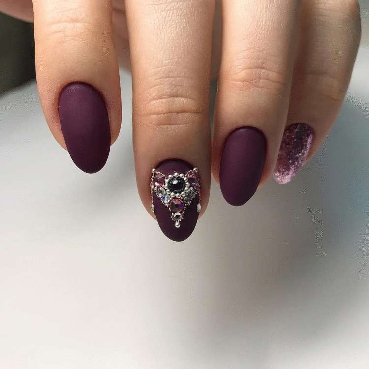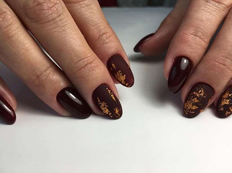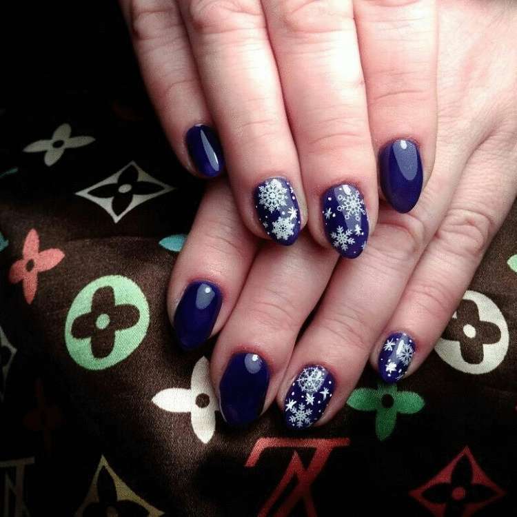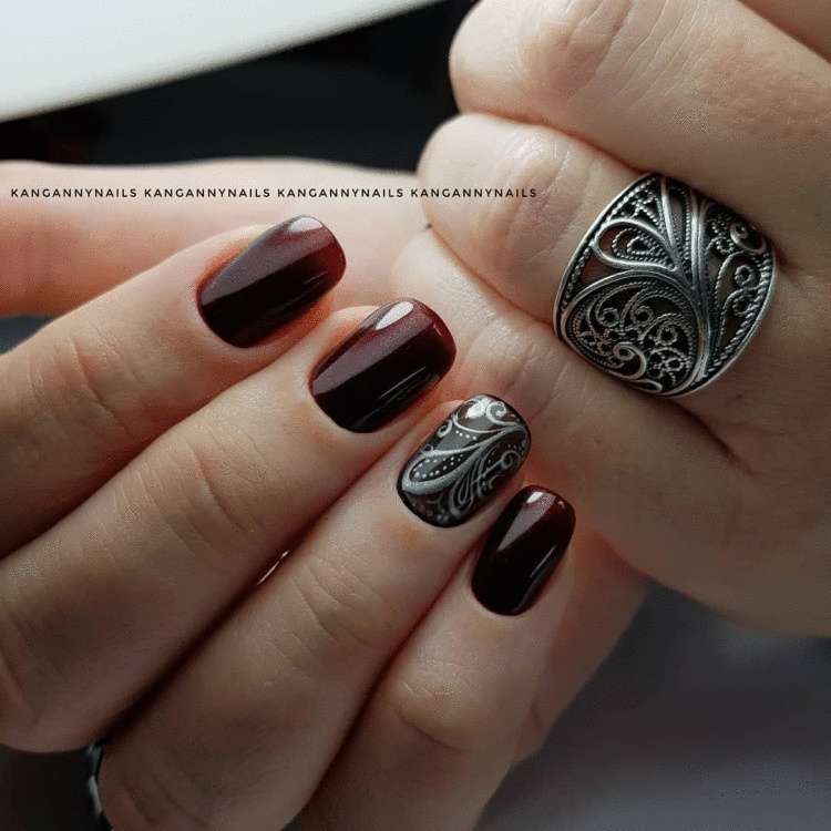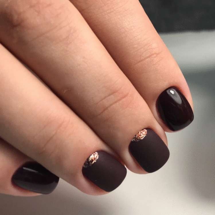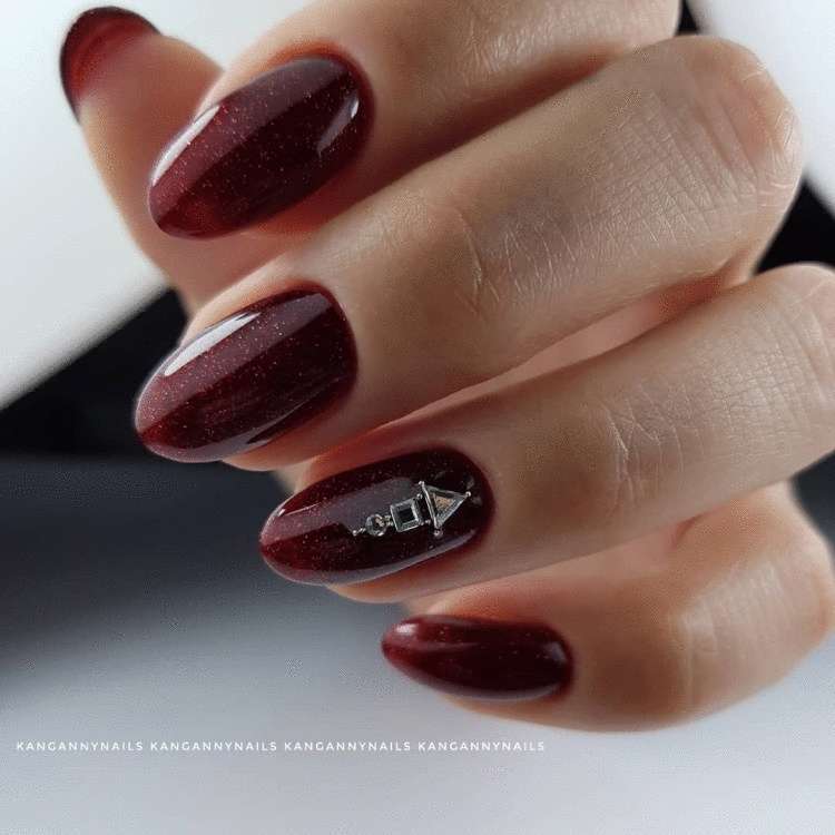 Выбирай оттенки темно-синего, бордового или даже черного цвета, но помните, что темный лак привлекает внимание к форме ногтей. Совет: нужно оставить незакрашенным пару миллиметров по бокам ногтя.