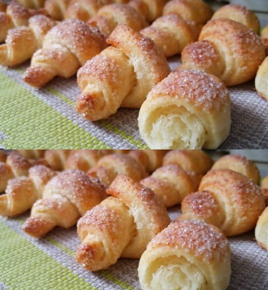 - Кожен трикутник звертаємо рулетиком і викладаємо печиво на деко, застелене пергаментом. Можна ще зверху обсипати цукром або просто вмочити однією стороною в цукор.