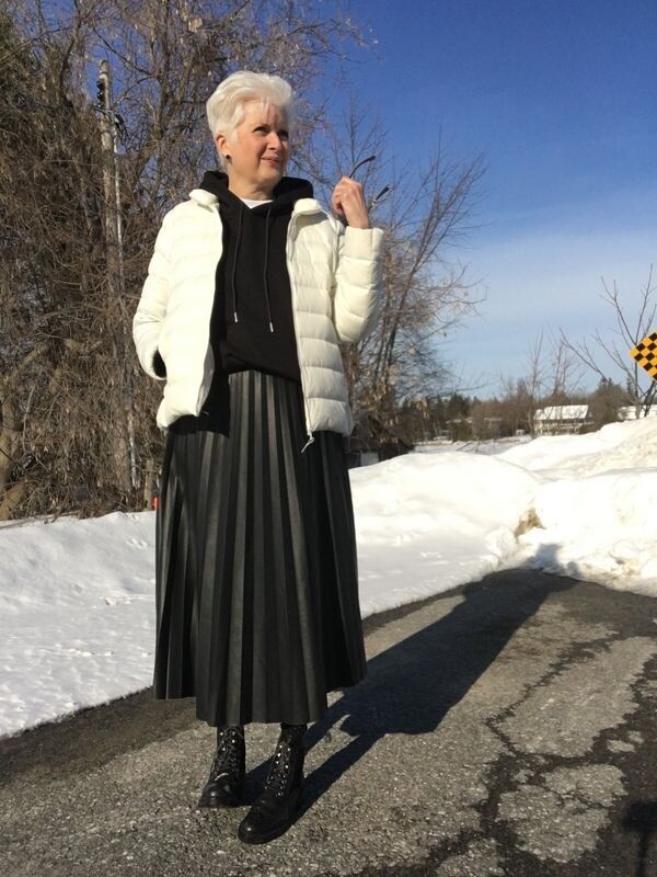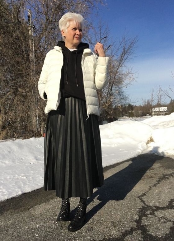 Чорна блискуча плісирована спідниця довжини міді, чорне худі та білий стьобаний пуховик створюють незвичайне, але гармонійне поєднання. Доповніть образ грубими чорними черевиками на товстій підошві, щоб підкреслити сміливість і стиль.