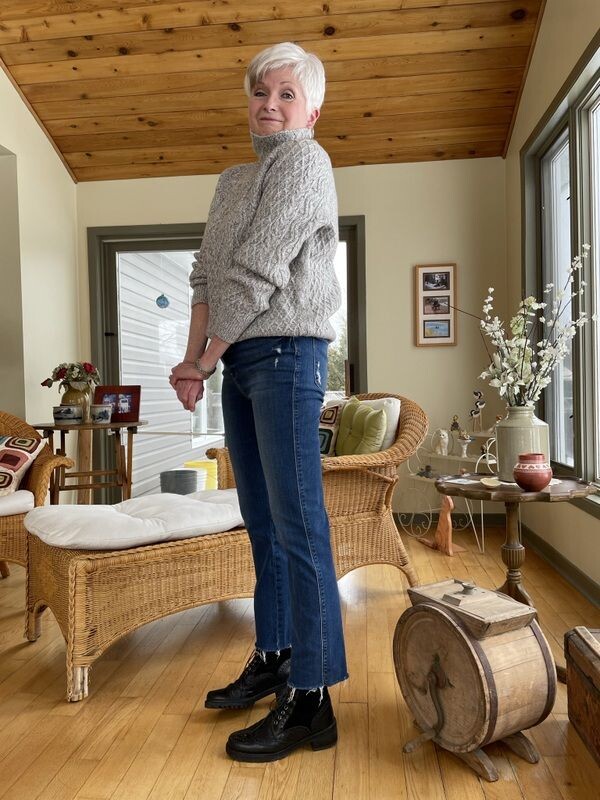 Стильні темно-сині джинси з необробленими краями чудово поєднуються зі світло-сірим фактурним светром. Оберіть до цього образу практичні чорні шнуровані черевики на стійкому підборі – і ви отримаєте ідеальний баланс між комфортом і вишуканістю.