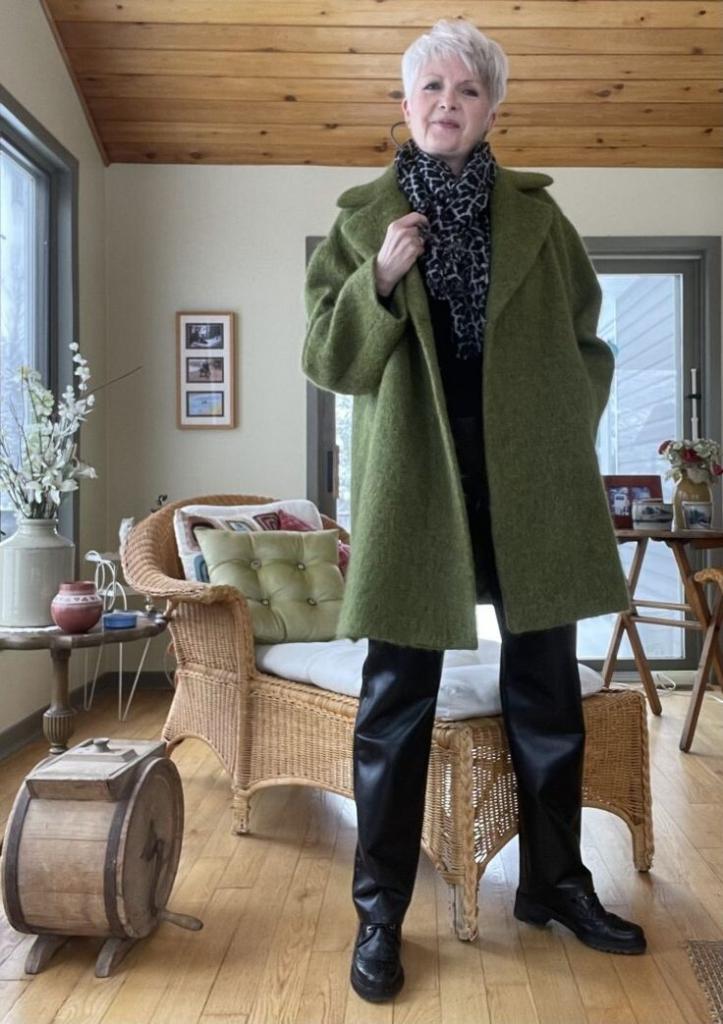 Прямі чорні шкіряні штани – досить зухвалий вибір для жінок старшого віку. Проте, якщо їх скомбінувати з приглушеним зеленим вовняним пальто класичного крою, образ стане гармонійним. Додайте шарф із чорно-білим анімалістичним принтом для завершення стилю.
