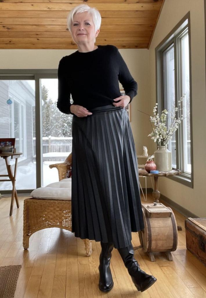 Темно-сіра плісирована спідниця-міді у поєднанні з чорним лонгслівом та високими чоботами – це елегантність у чистому вигляді. Такий образ ідеально підійде не тільки для прогулянок, а й для напівофіційних заходів.