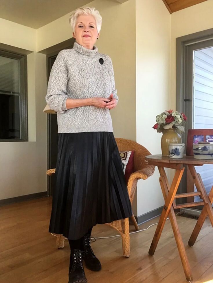 Плісирована спідниця-міді темно-сірого кольору чудово поєднується зі світло-сірим джемпером із широким горлом та фактурною в’язкою. Додайте масивні байкерські черевики на шнурівці для контрасту – і образ набуде оригінальності.