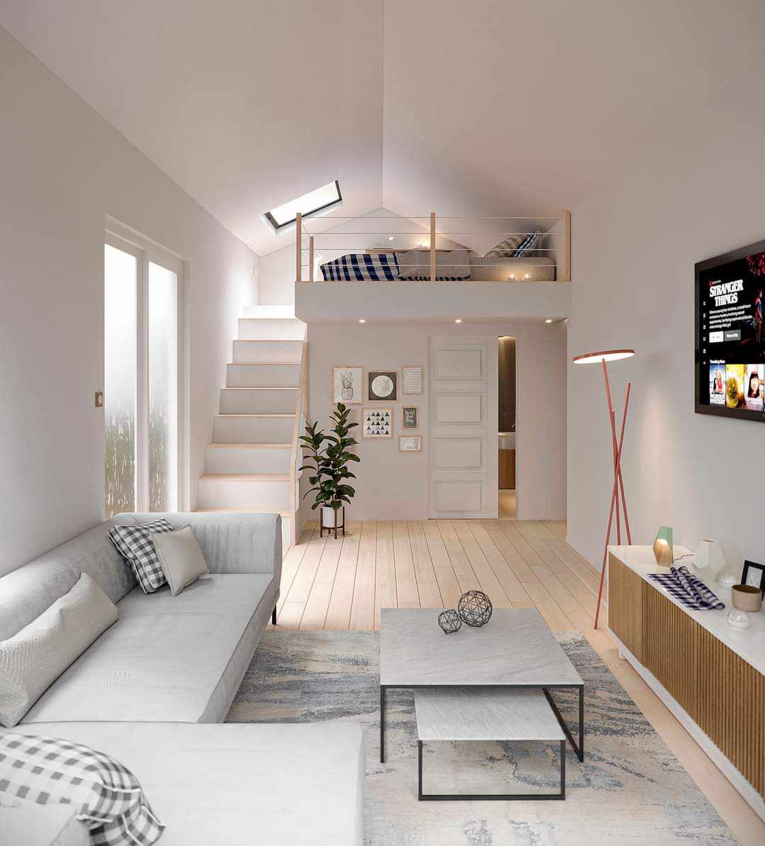 Используйте второй этаж для размещения кровати. Это отличный способ освободить место на первом этаже для других функций, таких как гостиная, кухня или рабочая зона.