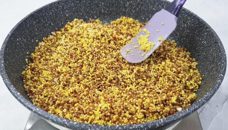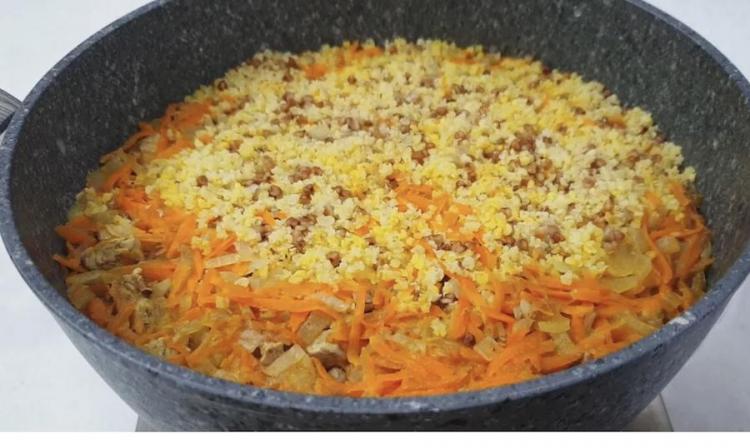 1. Гречану крупу та пшоно ретельно промиваємо, потім висипаємо на сковороду з невеликою кількістю олії та обсмажуємо близько 5 хвилин, щоб вони стали ароматнішими.