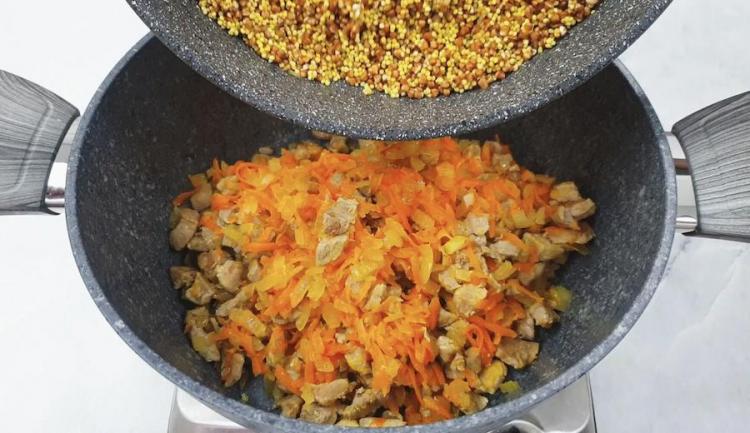 4. Перекладаємо обсмажене м’ясо з овочами в каструлю, додаємо туди ж підсмажені крупи.