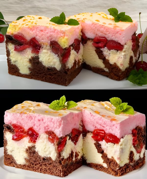 Пожалуй этот рецепт самый удачный из всех существующих. Десерт носит красивое название “Вишневая роса” и он действительно достоин так называться. Тесто очень нежное, пышное, шоколадное. Творожный слой в меру сладкий. Оттеняется белковой прослойкой и вишневым топпингом. Идеальное сочетание компонентов. И набор их прост: