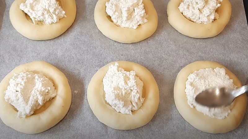 Склянкою робимо поглиблення в кожному коржі, куди кладемо начинку. Залишаємо ватрушки на 20 хвилин під целофаном, потім змащуємо яйцем і випікаємо при 180 градусах 20-25 хвилин.