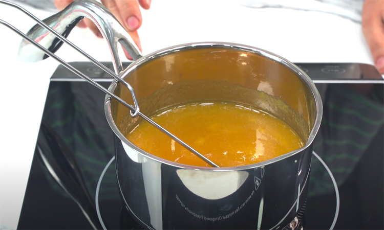В сотейнике соединяем пюре, воду, сахар и агар-агар. Ставим сотейник на средний огонь, доводим ее до кипения. Сразу делаем нагрев чуть ниже среднего, провариваем массу 4 минуты и снимаем сотейник с плиты.