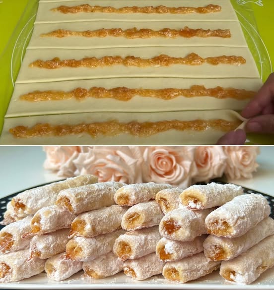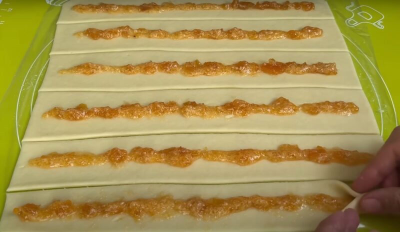- Змішуємо густе варення з кокосовою стружкою та викладаємо начинку вздовж кожної смужки тіста.