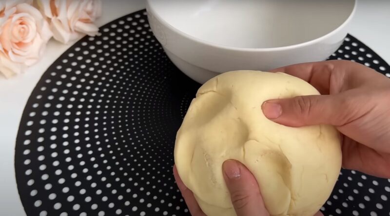 - Викладаємо тісто на харчову плівку й розкачуємо качалкою в не надто тонкий пласт.