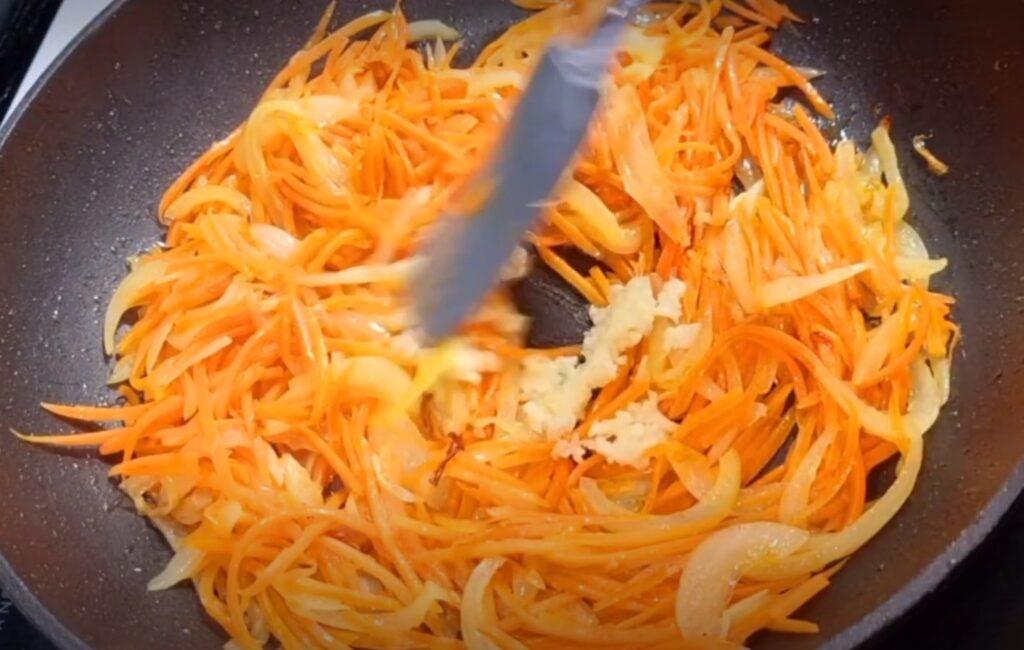 Обсмажуємо цибулю з олією в сковороді до м’якості. Додаємо до цибулі моркву, продовжуємо обсмажувати.