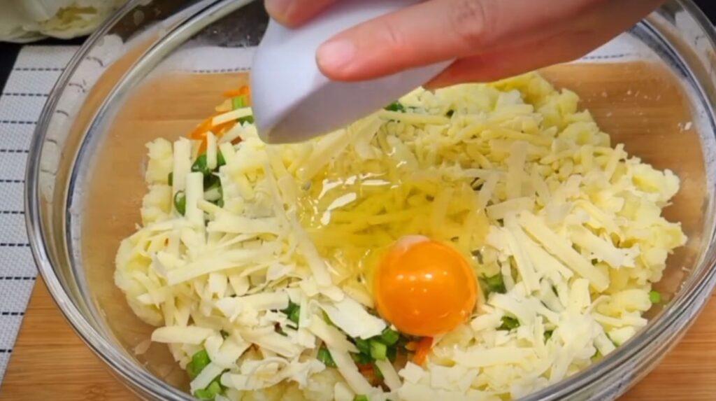 Не забуваємо посолити картопляну суміш, розбити в неї яйце, висипати борошно і ретельно перемішати.