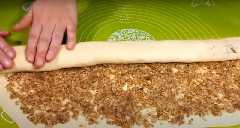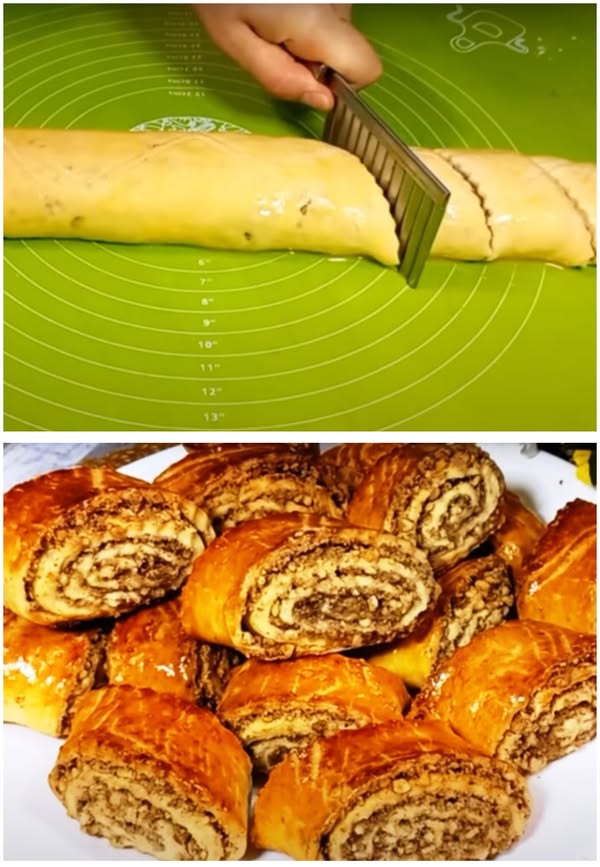 Вторую часть теста раскатываем в пласт толщиной 8 мм, смазываем ½ частью ореховой начинки. Сворачиваем пласт в рулет, смазываем по желанию желтком и делим на небольшие порции.