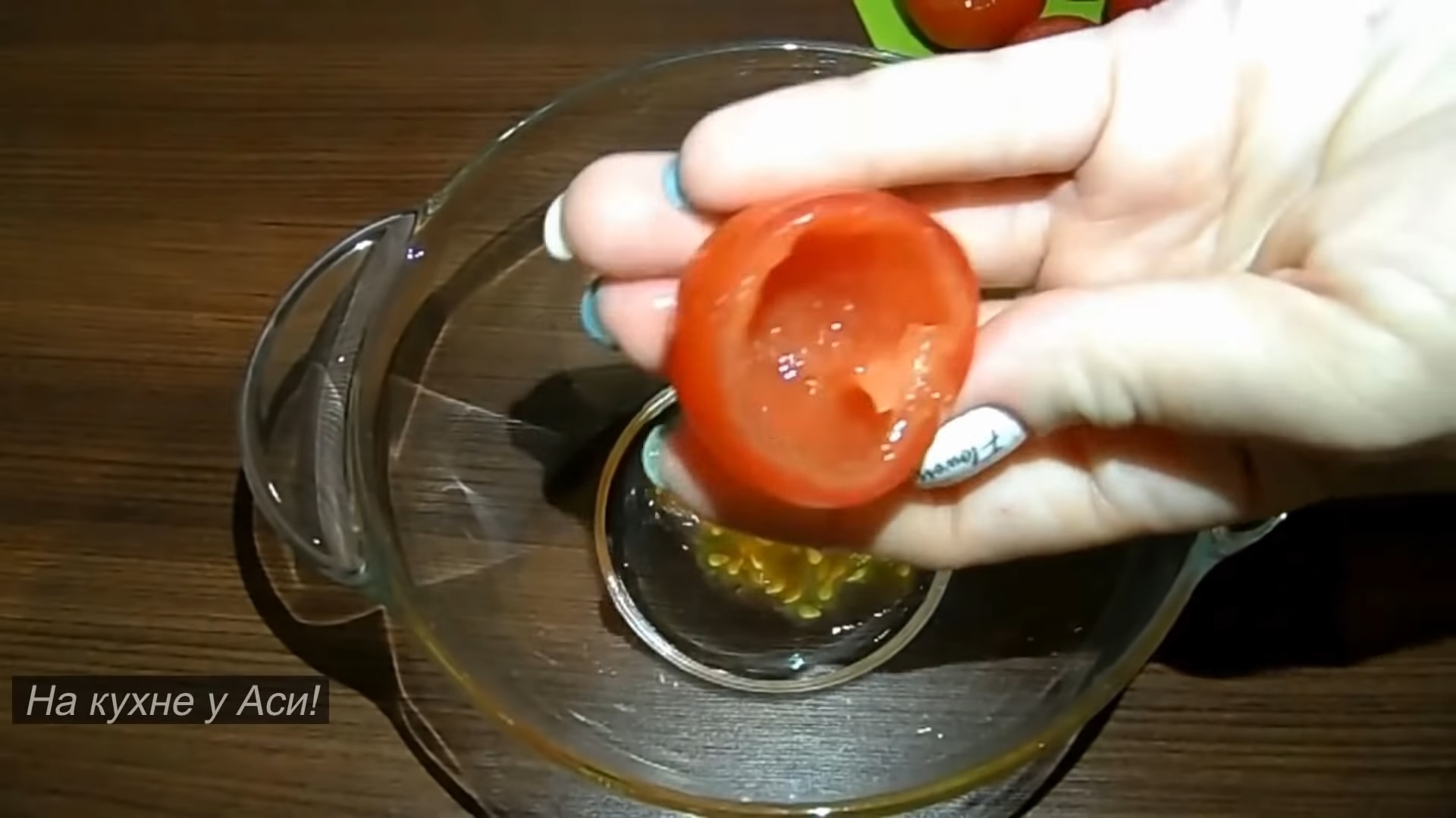 Капелюшки помідорів зрізаємо таким чином, щоб вони містили хребет і відкривали насіння. З помідорів видаляємо все насіння.