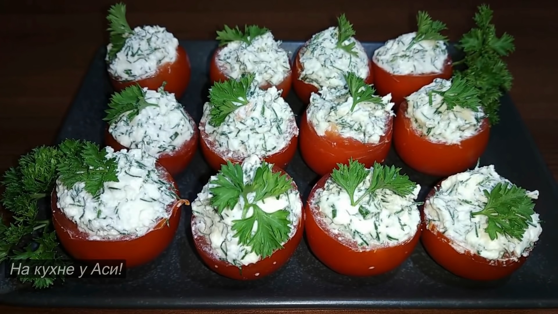 Сир розімніть виделкою, додайте дрібно нарізаний кріп, подрібнений часник, вершки і дуже добре перемішайте. Цією сумішшю заливаємо помідори і викладаємо їх на блюдо. Прикрашаємо свіжою зеленню.