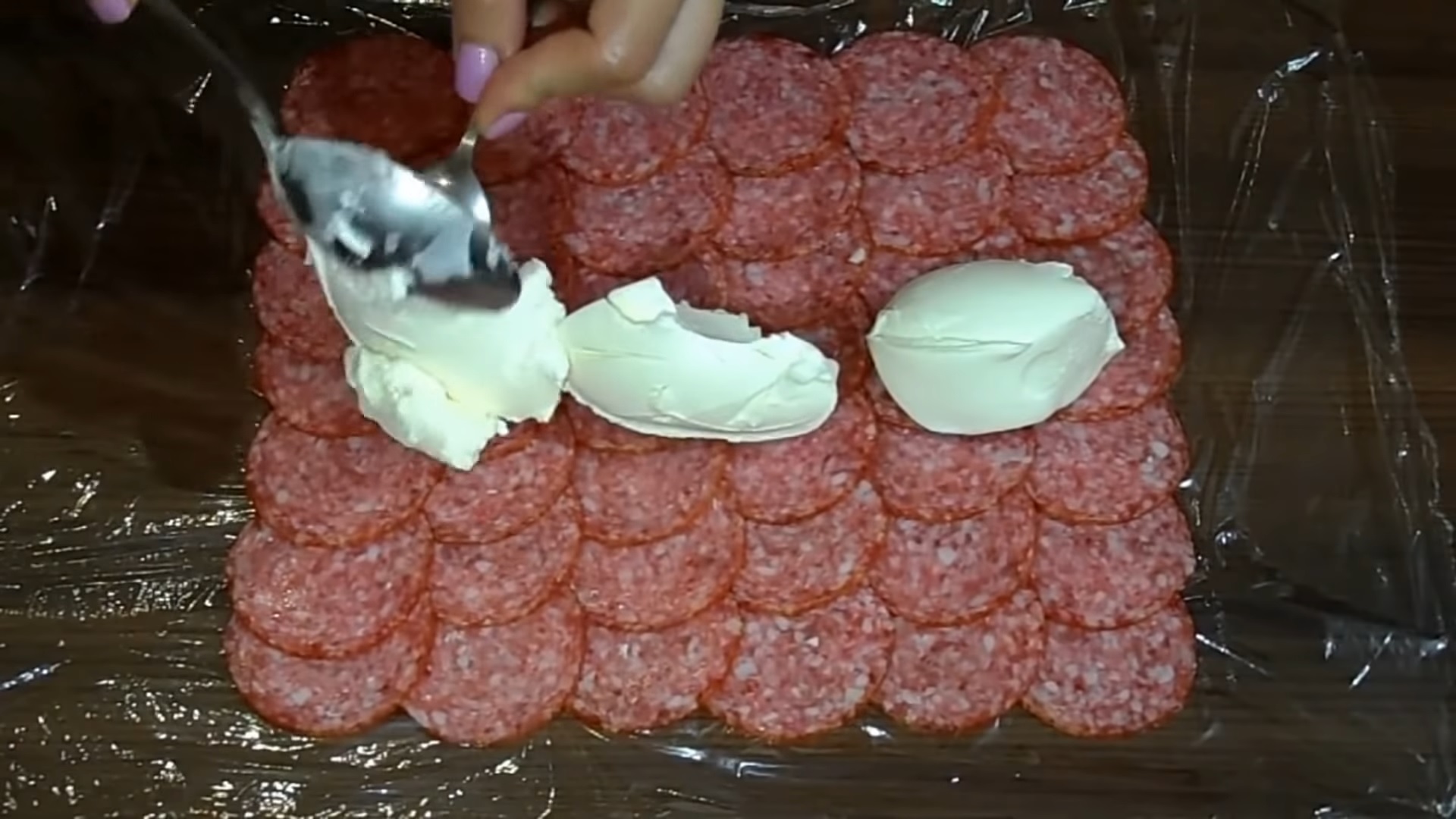 Розстеліть більший шматок харчової фольги на робочій поверхні. На неї укладаємо скибочки салямі таким чином, щоб вийшов суцільний верх із 6 стовпчиків по 7 скибочок, які трохи перекривають один одного.