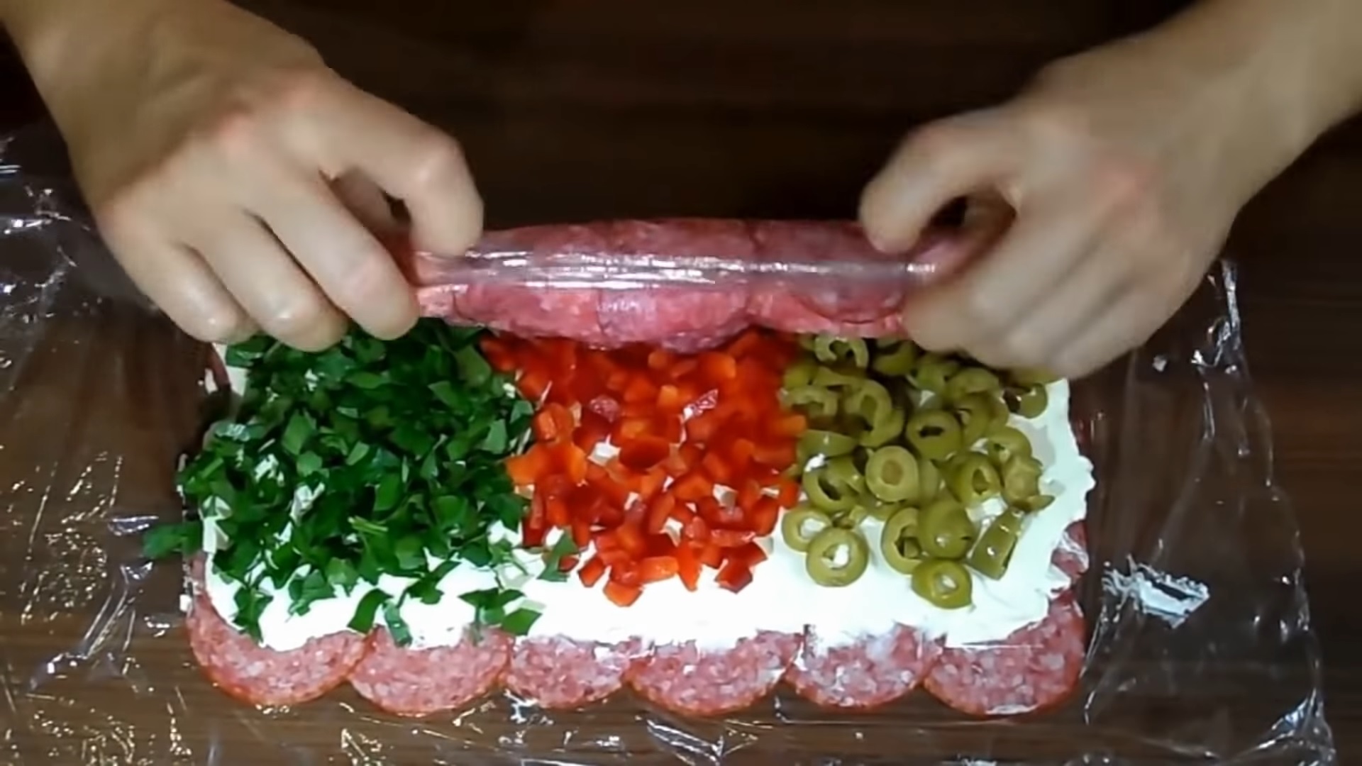 Поверх салямі викладіть вершковий сир, розкладіть скибочки оливок, кубики перцю та дрібно нарізану петрушку. Згортаємо у вигляді компактного рулету, допомагаючи фольгою. Загортаємо рулет у фольгу і прибираємо в холодильник на 2 години.