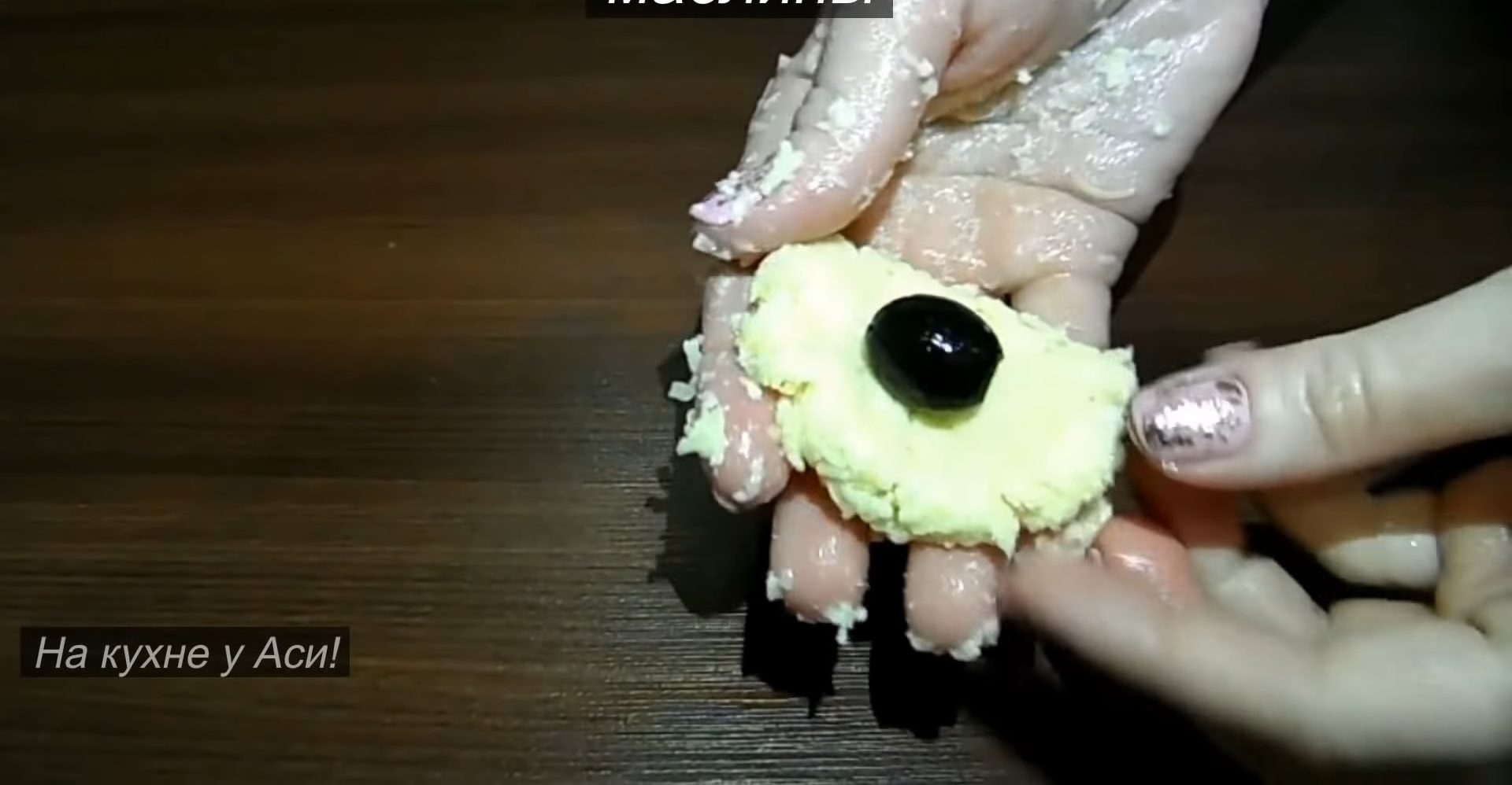Змішати натертий сир з подрібненим часником і майонезом. Беремо по 1 ложці цього складу і ліпимо корж, в середину кладемо оливку і формуємо кульку.