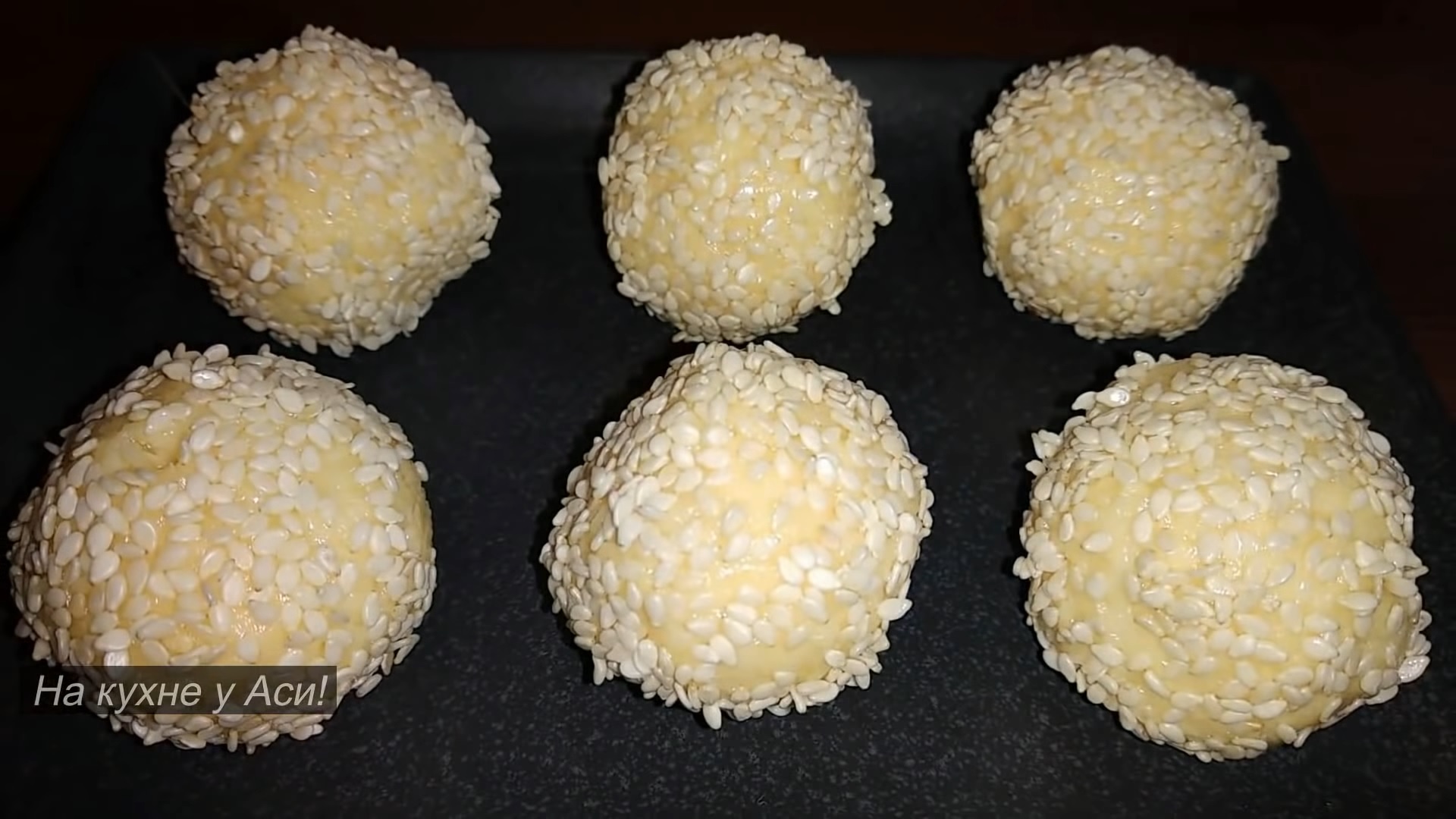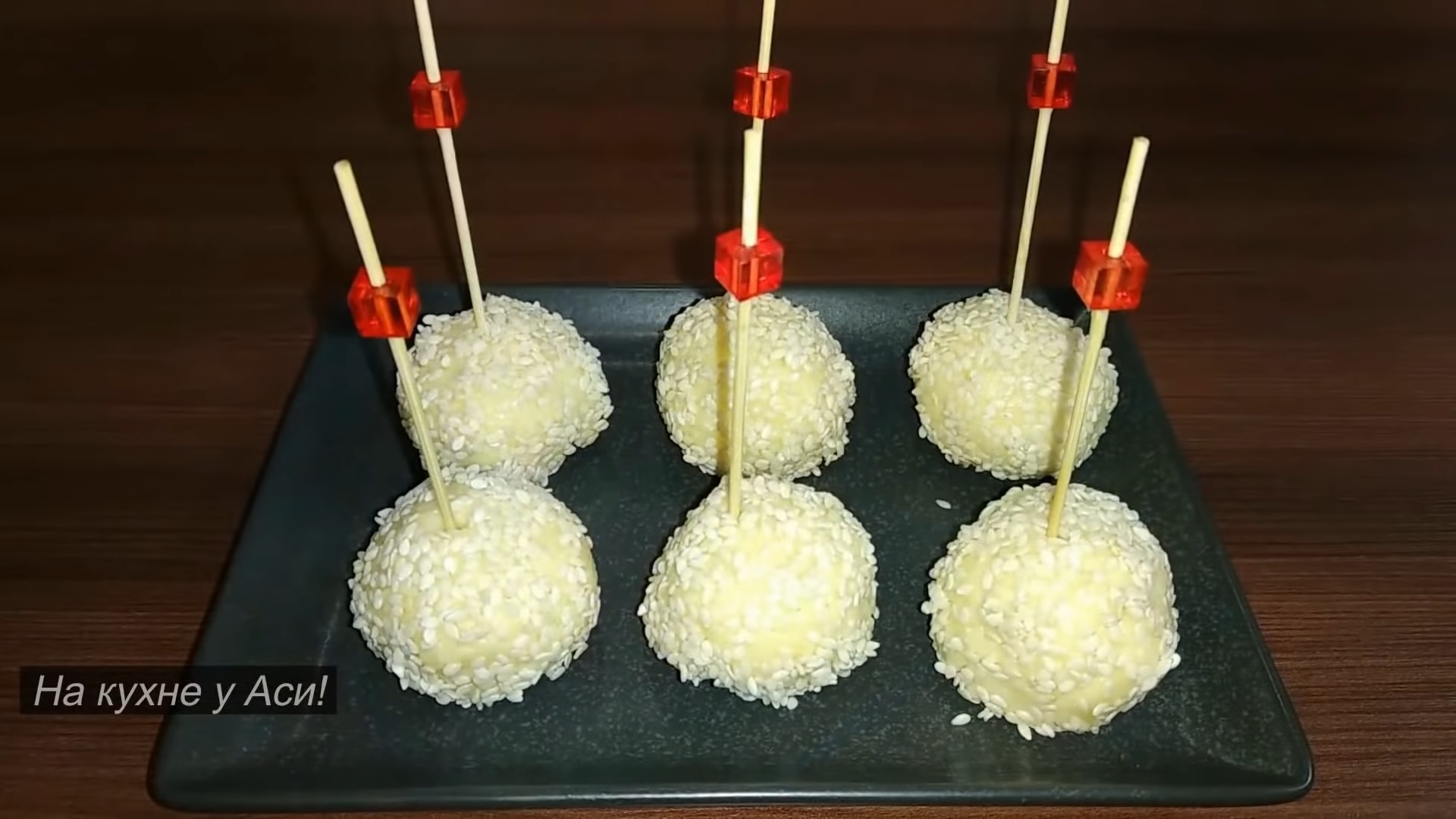 Обвалюємо кульки в кунжуті і викладаємо на блюдо.
