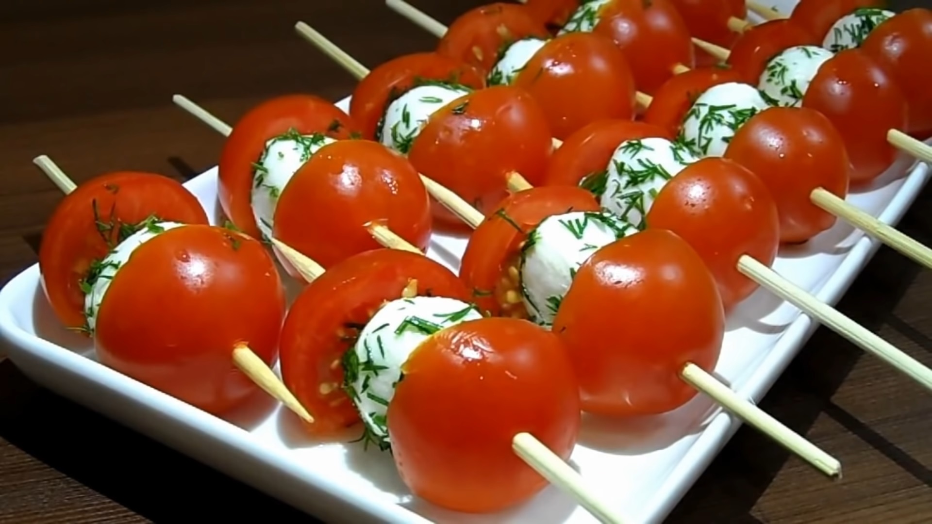 Помідори розрізати навпіл, кріп подрібнити. Пропустіть кульки моцарели через кріп. На зубочистку настроміть 2 половинки помідорів насінням всередину, вставивши між ними кульку моцарели.