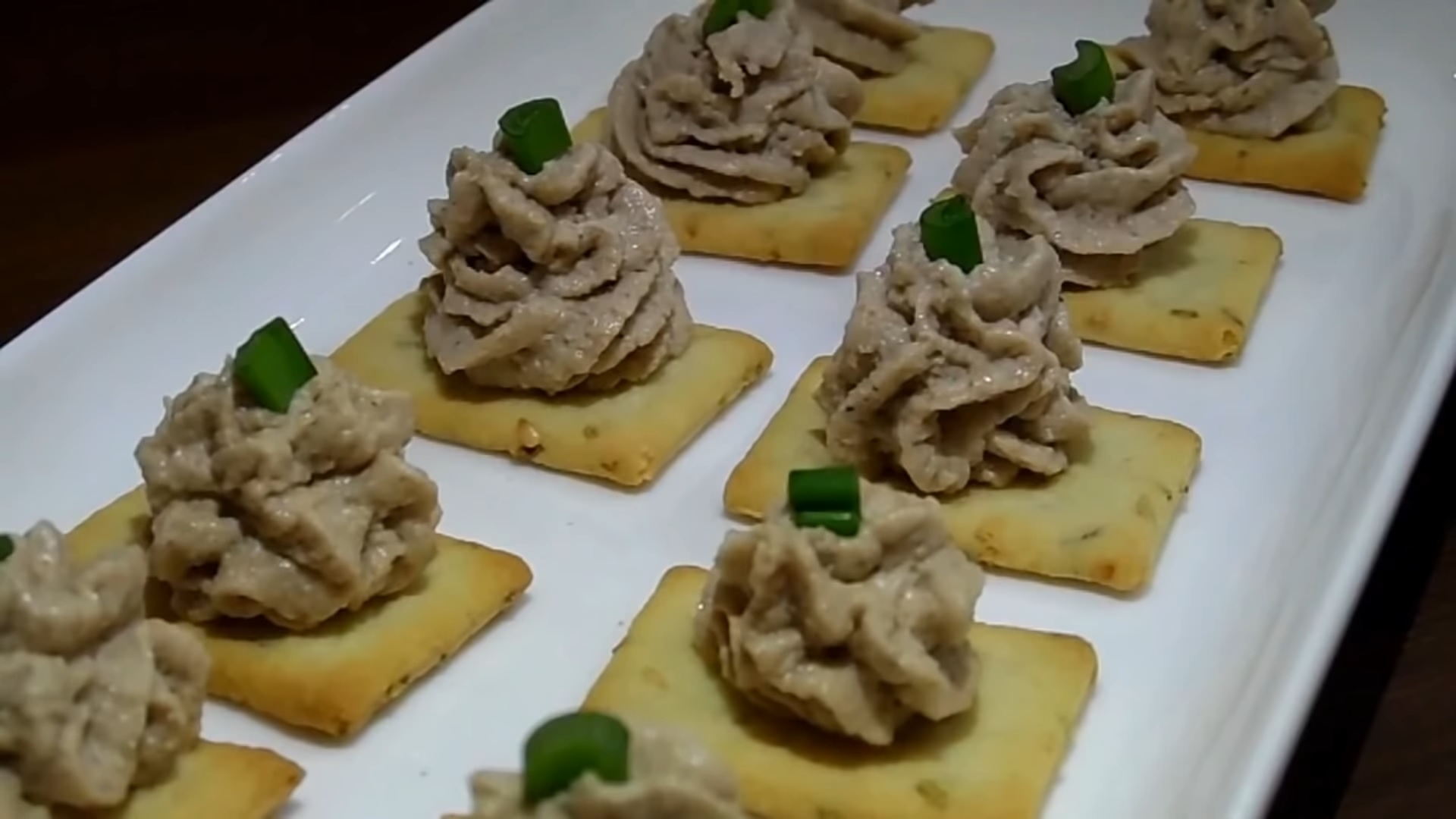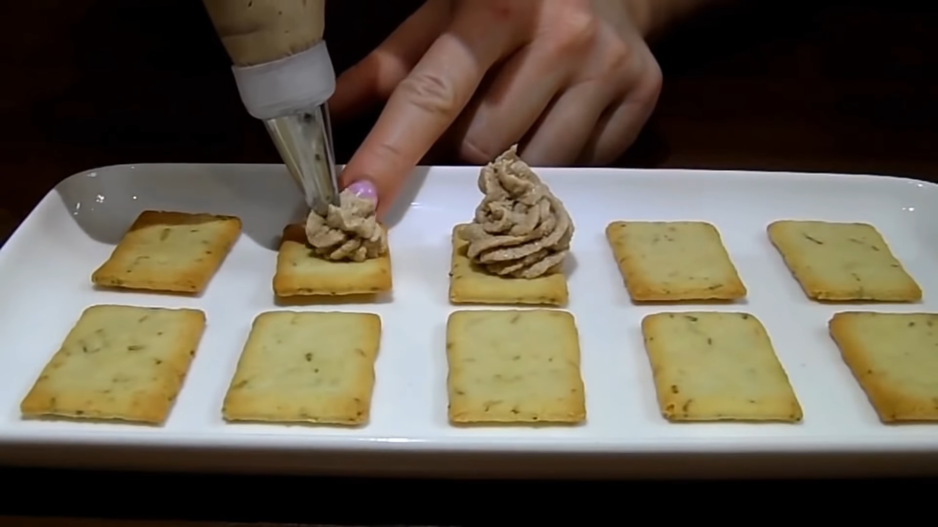 Викладаємо печиво на тарілку. Перекладаємо паштет в пакет і наносимо на бісквіти. прикрасити дрібно нарізаною зеленою цибулею.