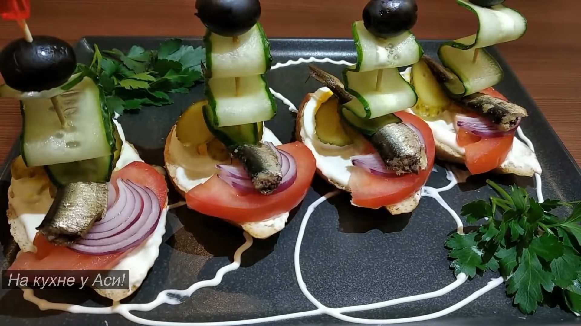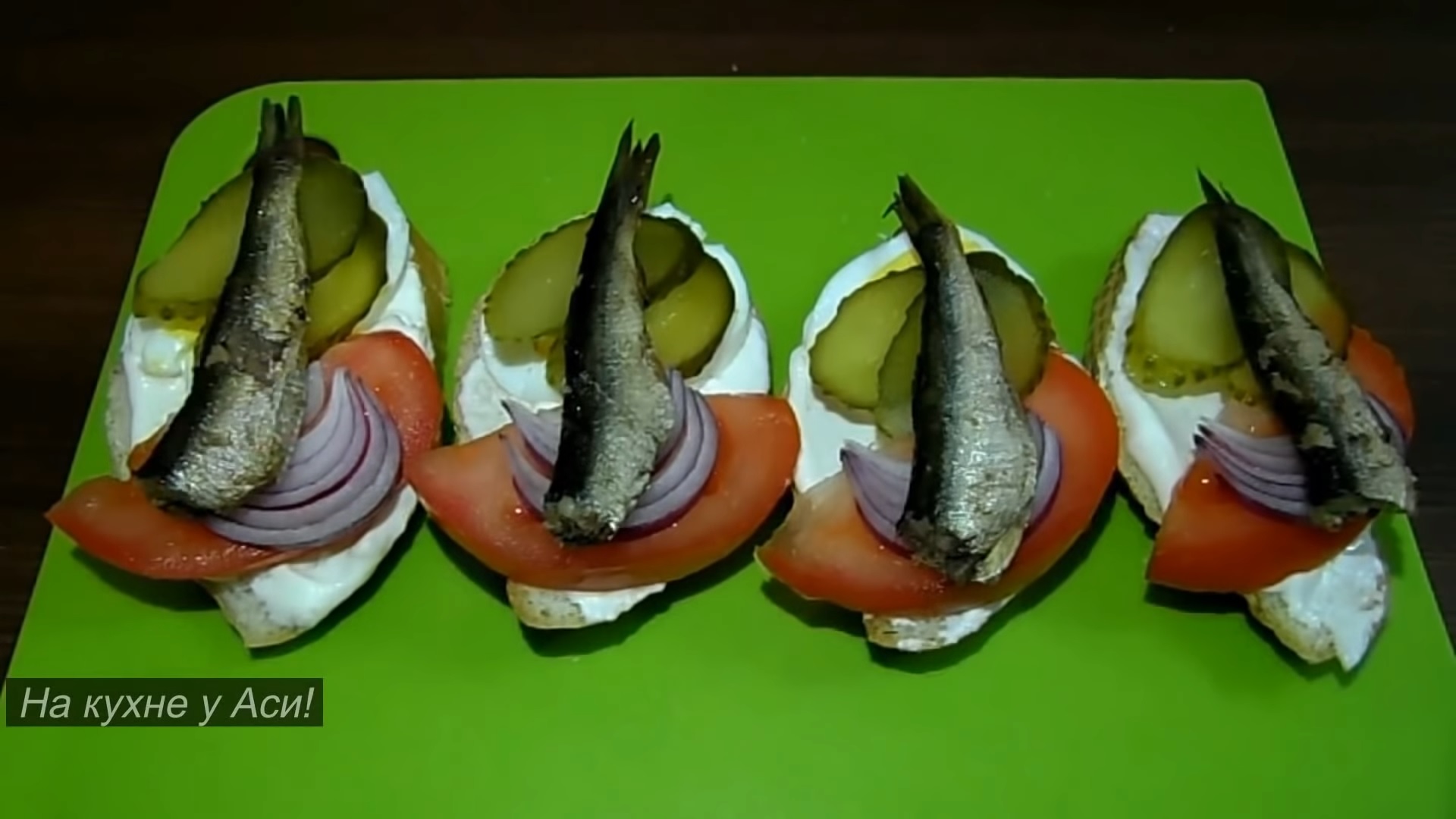 Змішайте майонез з подрібненим часником і намажте цією сумішшю скибочки хліба. На кожен шматочок хліба покласти кружечок вареного яйця і півмісяця помідора. Накрийте кружечки яєць 2 кружечками маринованих огірків і покладіть на кожен шматочок помідора півмісяць цибулі. На кожну розкладку також кладемо рибку.