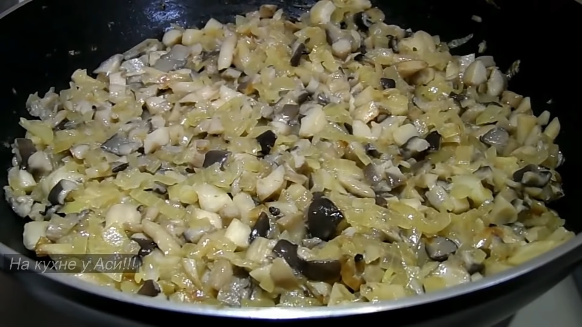 Розігрійте 2 столові ложки олії в сковороді, додайте цибулю і обсмажте її протягом 2 хвилин, поки вона не розм’якшиться і не підрум’яниться. Додати гриби, перемішати і смажити все разом 4-5 хвилин, поки не випарується рідина, що залишилася від грибів.