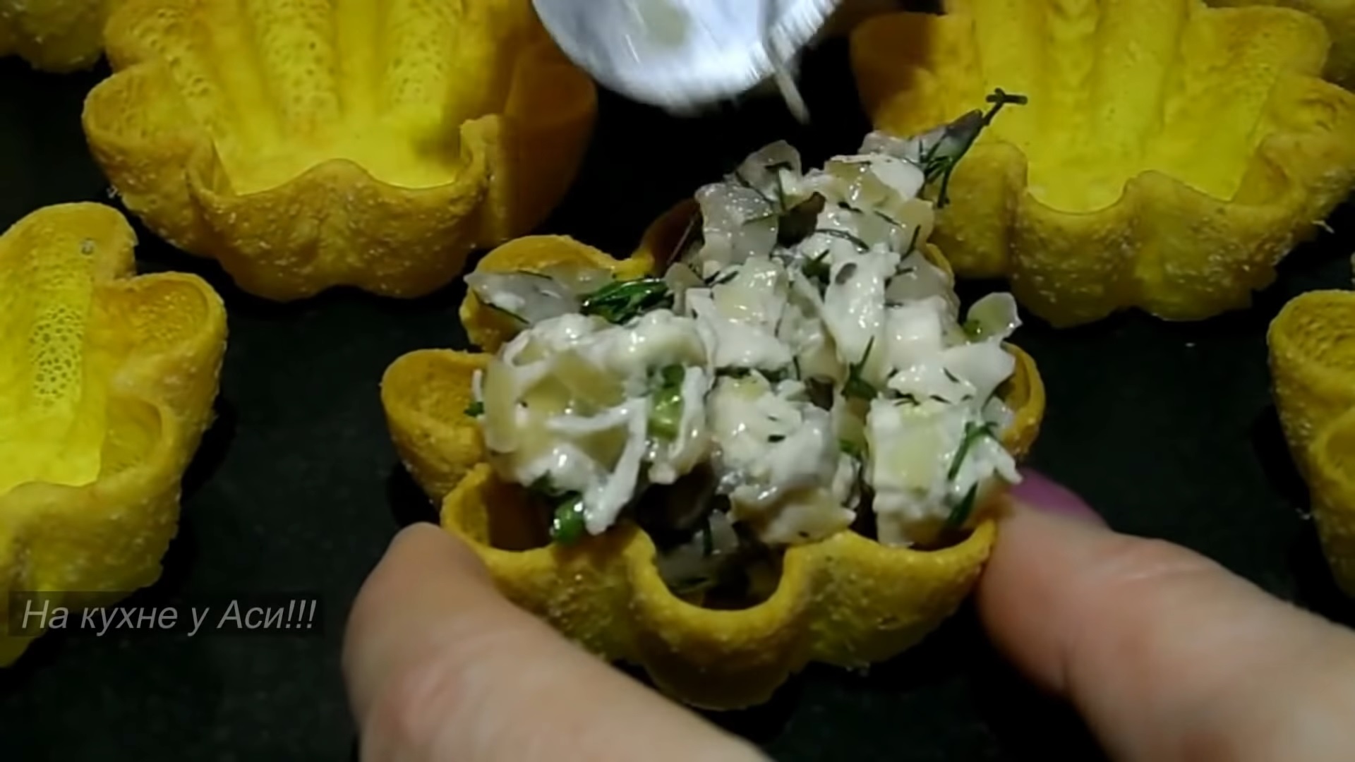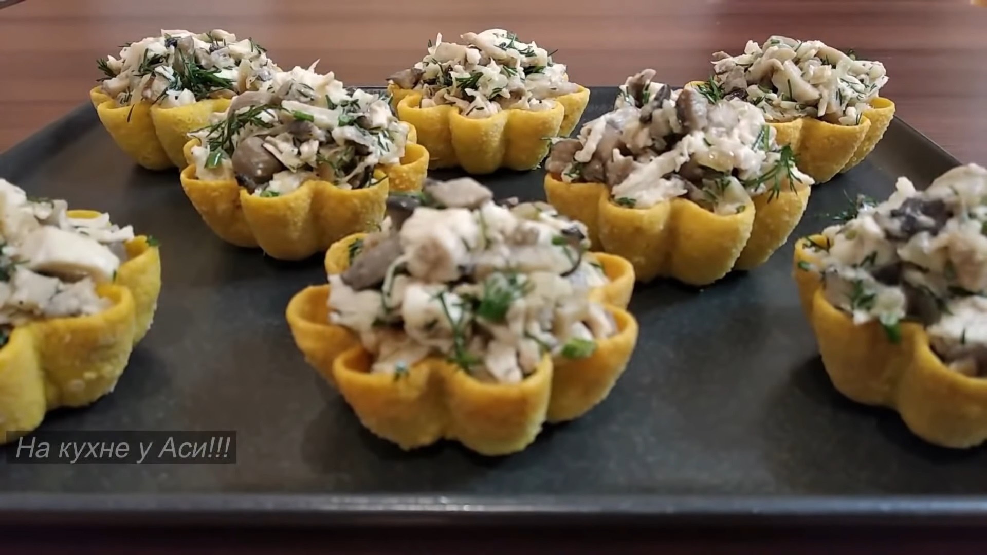 Викласти м’ясо у велику миску, додати цибулю та гриби зі сковороди, подрібнений часник, сіль, перець, кріп, майонез і дуже-дуже перемішати. Наповніть міні-тарти приготовленою сумішшю і викладіть на блюдо.