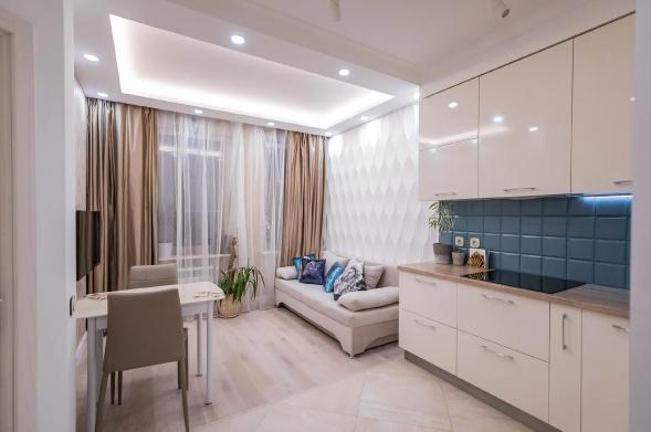 Владелица квартиры размером в 32 “квадрата” мечтала о ремонте. Ей хотелось, чтобы была отдельная спальня, кухня-гостиная, имелась гардеробная, а санузел совмещался с ванной. По этой причине планировка ее квартиры должна быть наиболее функциональной. Ремонтники использовали каждый миллиметр пространства.