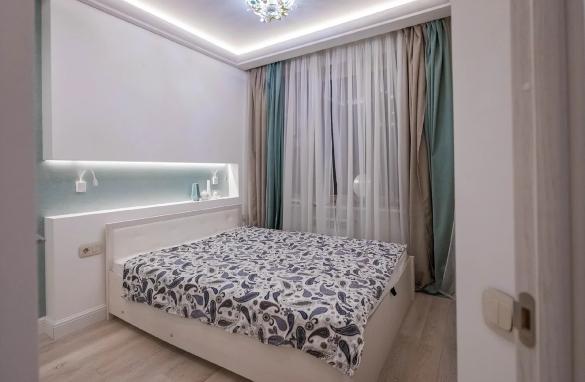 Спальня маленькая, поэтому решено было не ставить прикроватные тумбы. Вместо них установлена ниша за изголовьем с подсветкой.