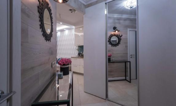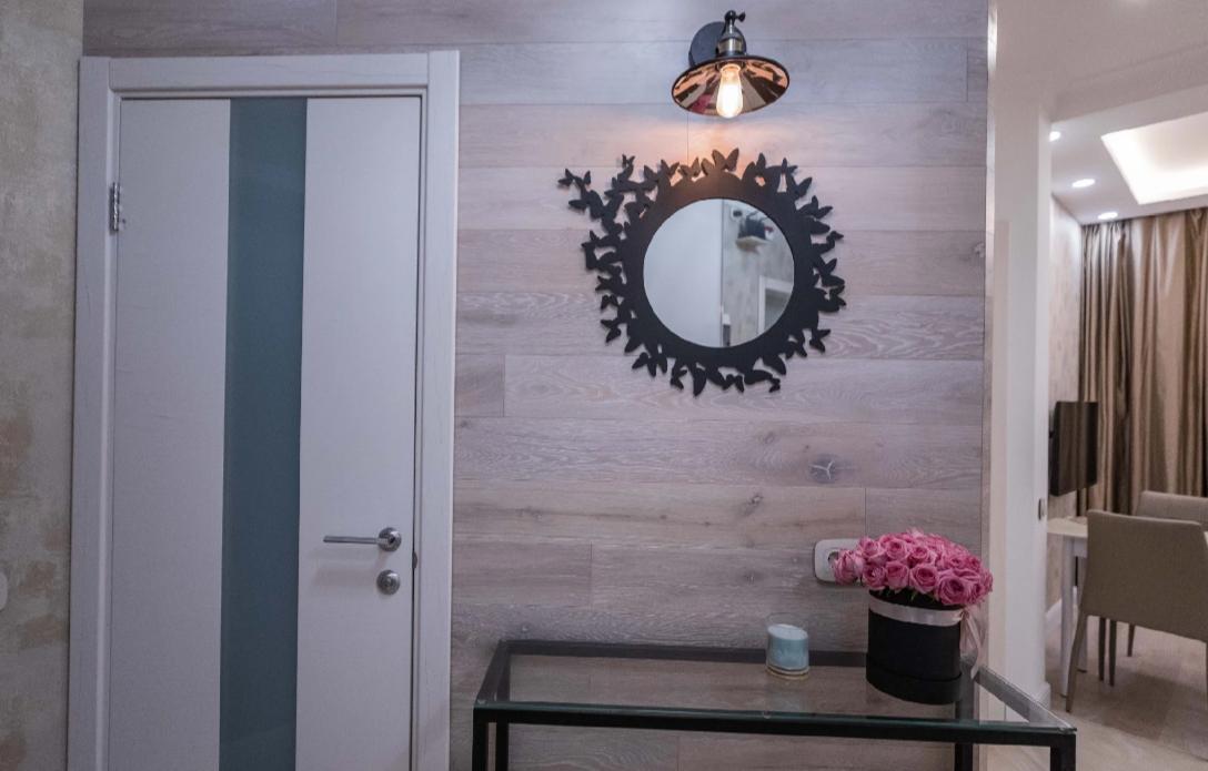 Направо от входа в квартиру появилась еще и отдельная гардеробная. Ее отделили от остального помещения раздвижной зеркальной дверью.