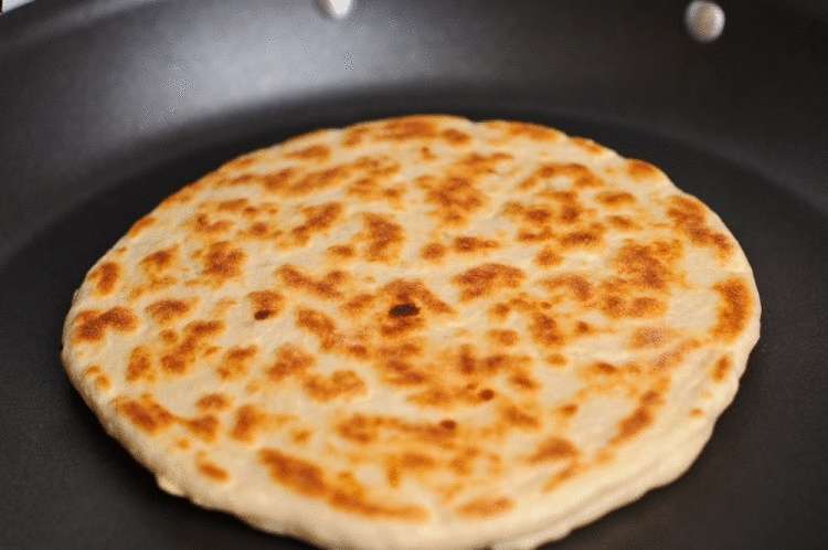 Начинку кладем посредине пласта, соединяем его края. Потом раскатываем мешочек, не сильно надавливая на него и переворачивая на разные стороны. Хачапури выпекаем на разогретой сковороде. Масла не наливаем. Сверху на хачапури выкладываем несколько кусочков сливочного масла.