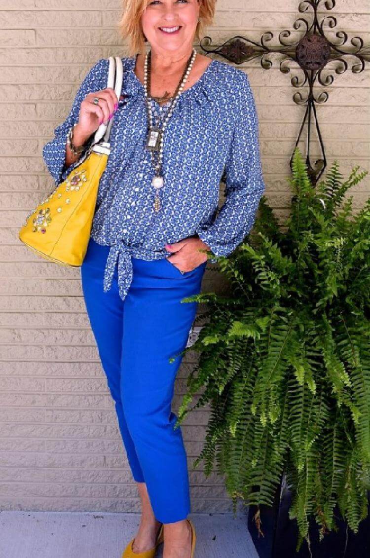 10.Яркая комбинация насыщенного синего и темно-желтого — эффектный вариант для летнего отдыха. Свободная блузка с принтом скроет лишние сантиметры, а бусы завершат наряд.