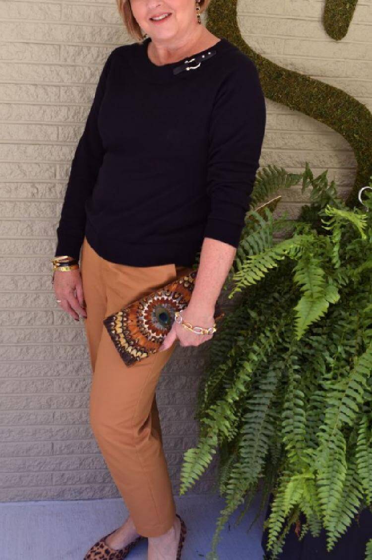 11.Коричневые брюки чинос и черная кофта так и требуют ярких принтов. Добавьте их в аксессуарах — леопардовые босоножки, необычный клатч и золотистые украшения подойдут лучше всего.