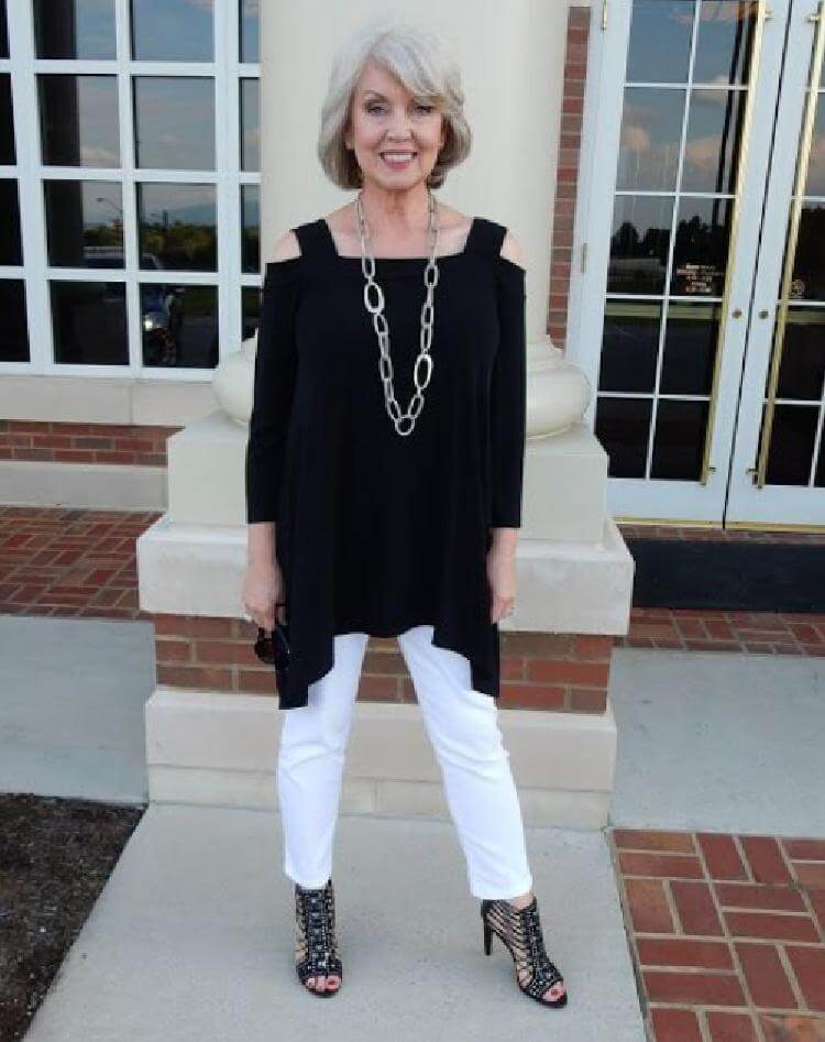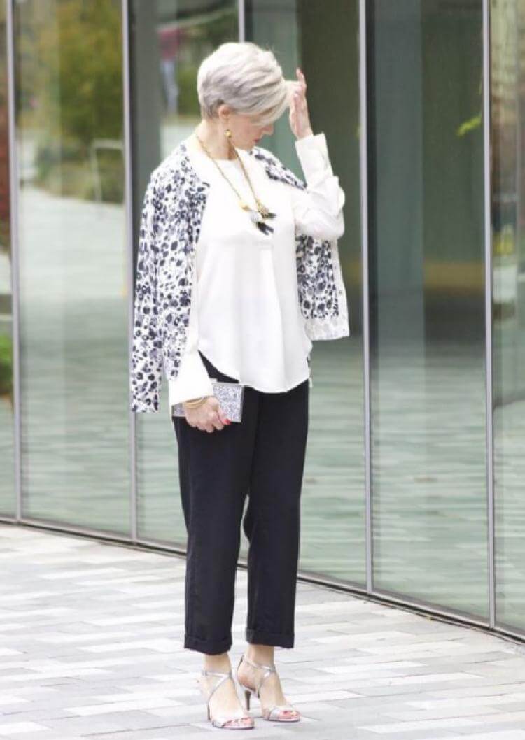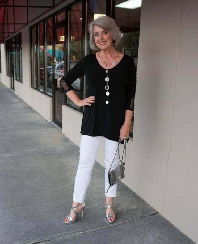 13.Еще одно сочетание с черной кофтой и белыми чинос. Серебристые аксессуары и длинное колье делают наряд более женственным.