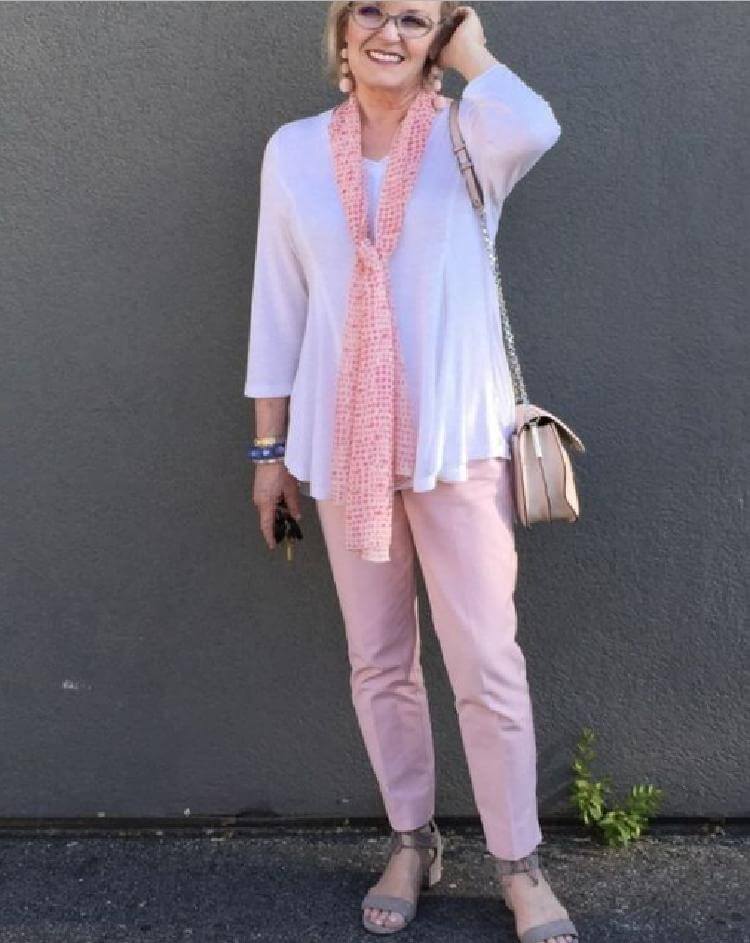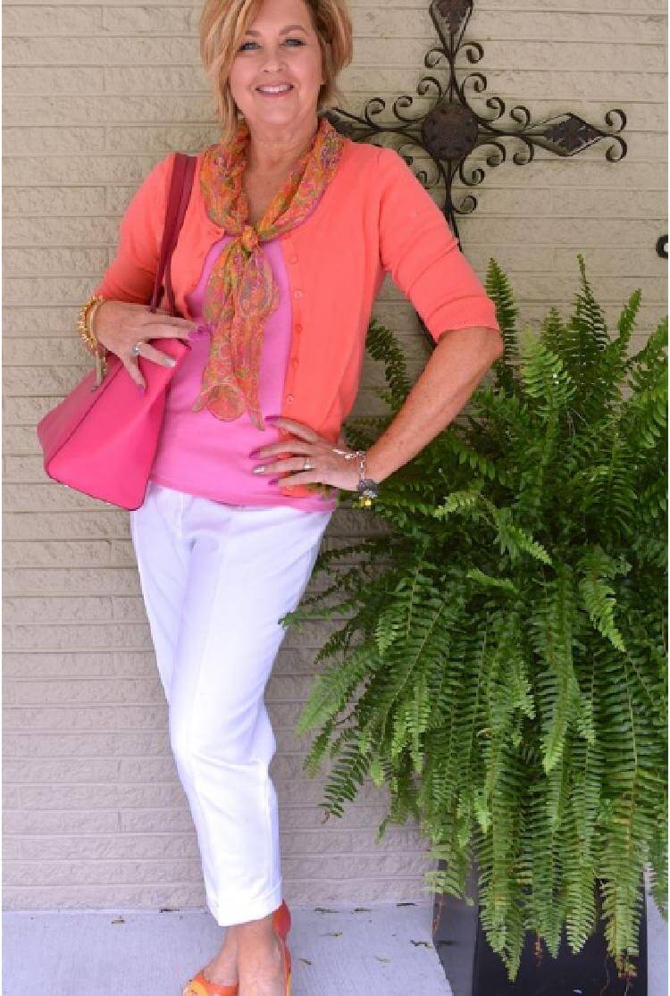 9.Необычайно нежно и женственно выглядит сочетание белых чинос с разными оттенками розового. Светло-розовая футболка и персиковая кофточка, сумка оттенка фуксии — и все это гармонично завершается цветастыми балетками и платком.