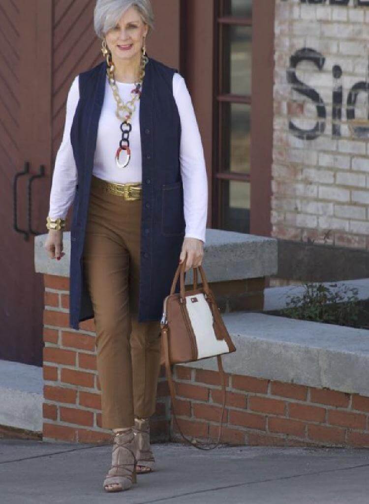 2.Коричневые брюки чинос идеально сочетаются с золотистыми аксессуарами — ремнем, сумкой, украшениями и вставками на обуви. Чтобы не выглядеть чересчур блестяще, добавьте аккуратную белую кофту и удлиненную жилетку.