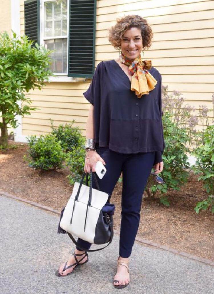 4.Темные брюки чинос и просторная рубашка в тон — простой образ на каждый день. Его легко сделать ярким: стоит лишь добавить шейный платок и белые аксессуары.