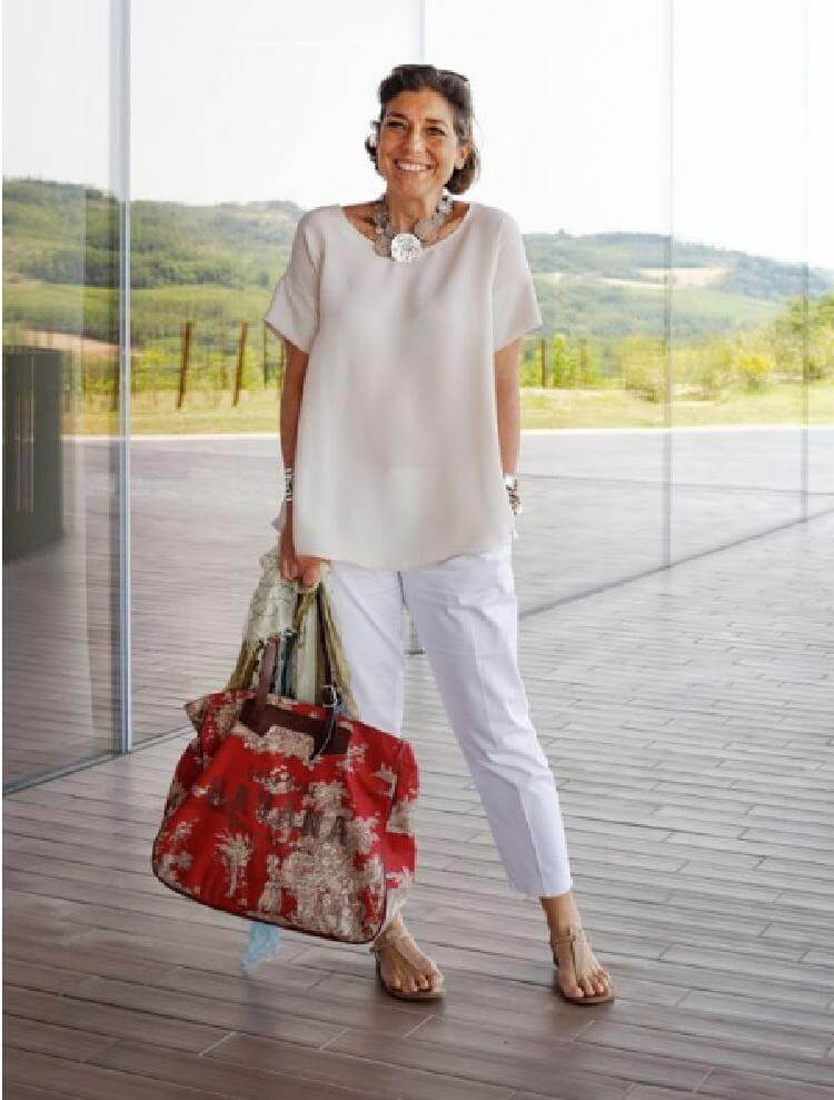 7.Белые брюки, свободная светлая футболка и аккуратные сланцы — лучший наряд для отдыха. Он хорош как сам по себе, так и в сочетании с крупным колье, серьгами и пляжной сумкой.