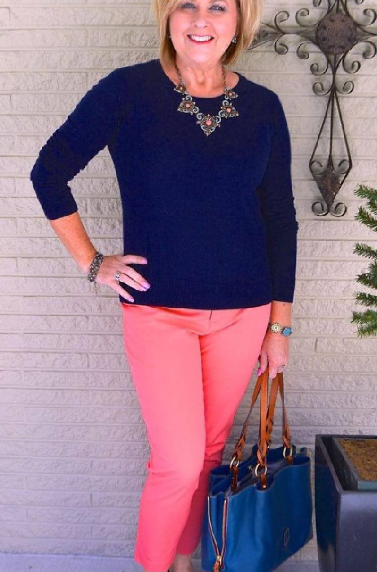 8.Брюки нежного лососевого оттенка отлично сочетаются с темно-синими свитером и балетками. Сумка в тон и колье — образ для работы, похода в гости или прогулки готов.