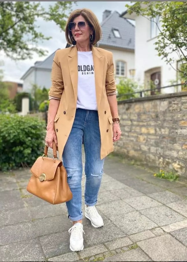 Прямые джинсы с удлиненным пиджаком: Простой, но выразительный образ.