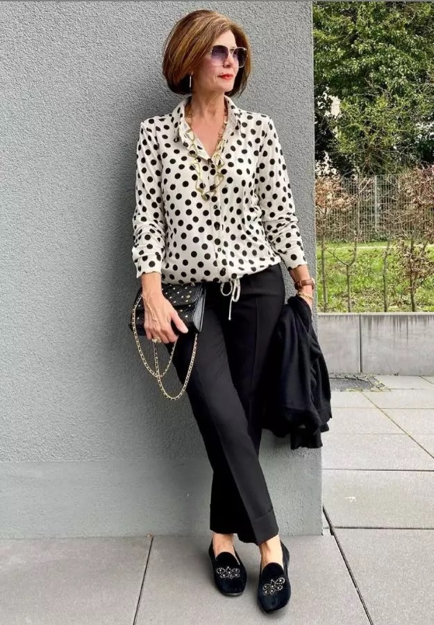 Черные брюки со стрелками: С блузкой в горошек и лоферами, представляют безупречную классику.