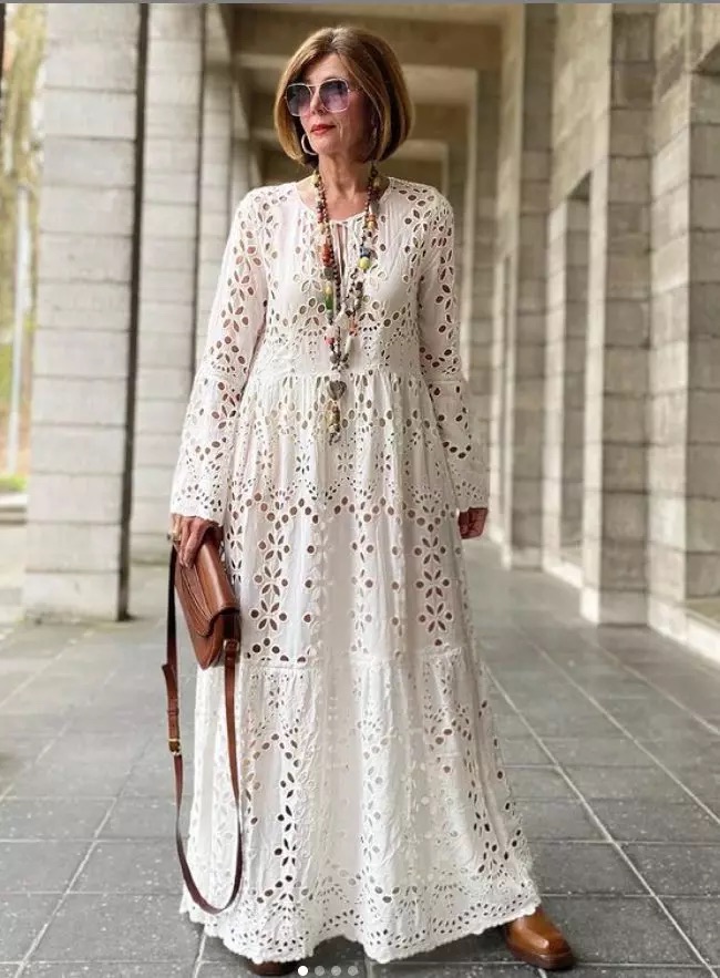 Белое макси-платье: С ажурным декором, выражает утонченную элегантность.