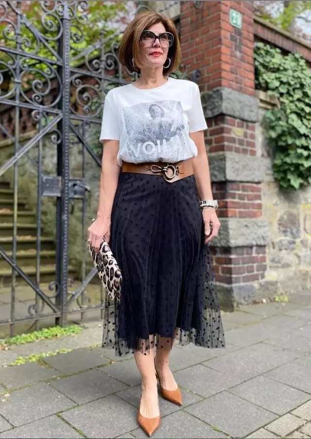 Прозрачная юбка в горошек: С белой футболкой, создает нежный и романтичный образ.
