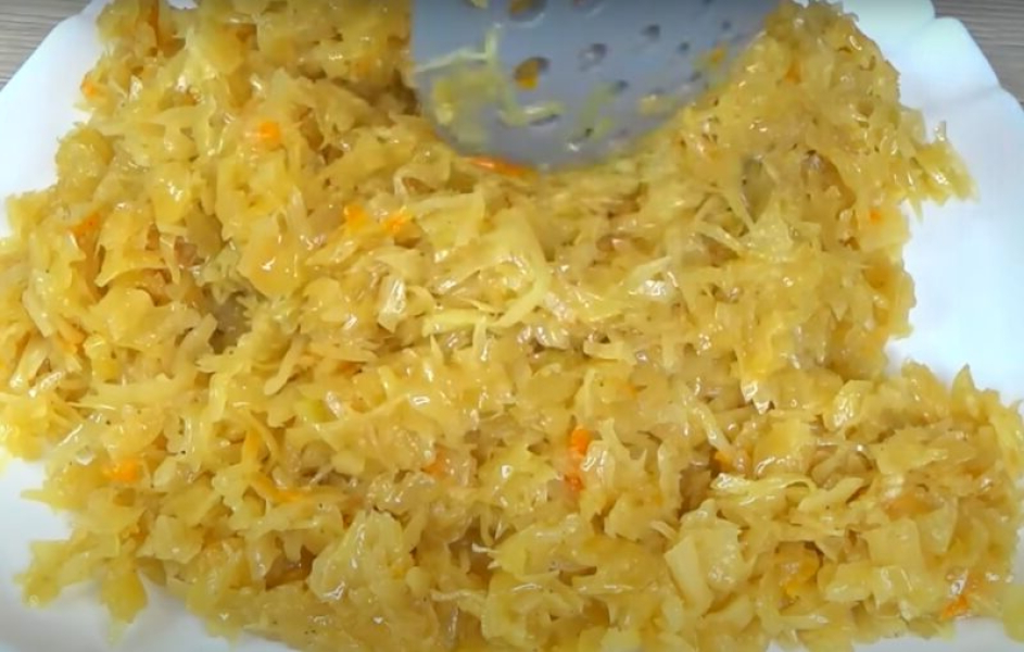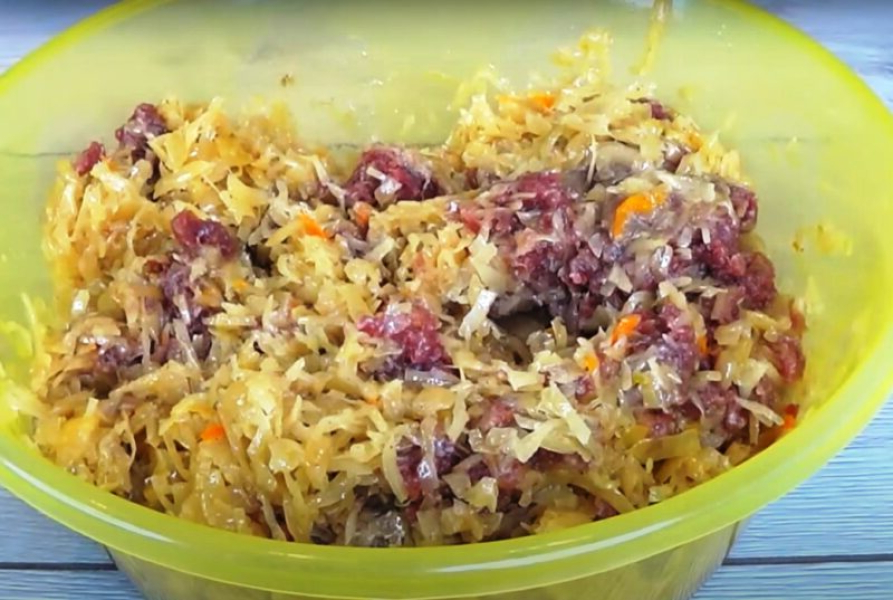 До цибулі викладаємо квашену капусту, обсмажуємо овочі разом. Додаємо до суміші трохи води, тушкуємо капусту з цибулею.