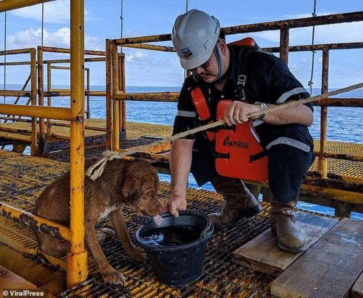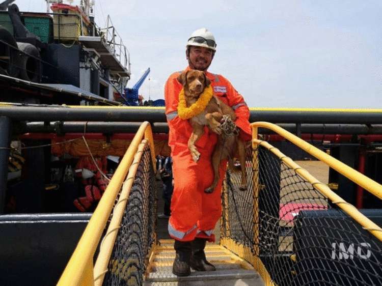 Сотрудники плавучей буровой платформ, размещенной в Сиамском заливе, совершенно случайно за бортом увидели необычного пловца. посреди довольно высоких волн из последних сил плыла… собака! Она по появлялась на виду, то исчезала за гребняли. Люди подозвали обессиленное животное и поймали его с помощью металлической сетки, потом накинули трос и вытащили на платформу.